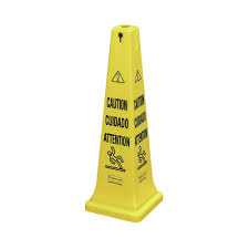 Highly visible, 36", bright yellow hazard protection cone. English/Spanish safety communication utilizes ANSI/OSHA-compliant color and graphics.Caution Safety First warning message imprinted in English and Spanish provides effective communication to a broad audience Versatile top design accommodates barricade belt, flashing light, lock-in sign holder, and Audio Guard accessories Four-sided shape allows for efficient stacking Molded-in slots for easy handling