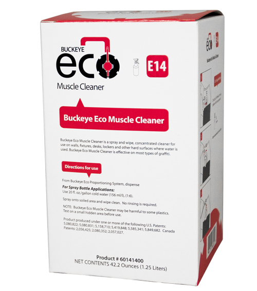 When you want spray and wipe jobs done right the first time, use Buckeye Eco Muscle Cleaner. Buckeye Eco Muscle Cleaner quickly liquefies and lifts soils for easy removal without hazardous ingredients. Buckeye Eco Muscle Cleaner removes graffiti, ball-point ink, permanent marker, crayon, pencil, black heel marks, food soils, grease, oil, dyes and most stains. With Buckeye Eco Muscle Cleaner, there s no rinsing required and no residue left behind!