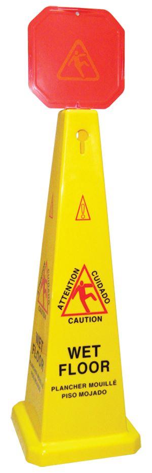 Trilingual English-French-Spanish safety warnings Two colour red ; black message for increased visibility Attention-getting sign locks securely into the slot on top of the cone Stackable for economic storage and transportation Cone is 36" high moulded in bright yellow with a 10" red warning sign secured on top Overall Dimensions: 12" Sq. Base x 46" H