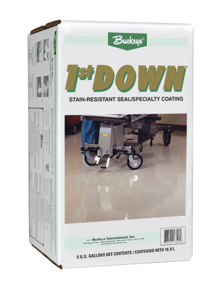 1st Down is a semi-permanent undercoating for Buckeye floor finishes that resists stains and detergents, and protects your floors from dirt penetration. 1st Down is self-leveling and you may apply it to virtually any resilient and hard floor surfaces. You can also use it alone as a sealer/top coat combination on non-resilient floors (quarry tile, brick, concrete, terrazzo, etc.).